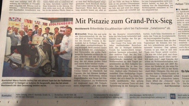 Auf der M.I.G 2014 (internationaler Wettbewerb für Eishersteller) hat das Eiscafé Venezia in Birkenfeld von 100 Teilnehmer aus der ganzen Welt den 3ten Platz bei Coppa d'Oro (Oscar der Eishersteller) und den
